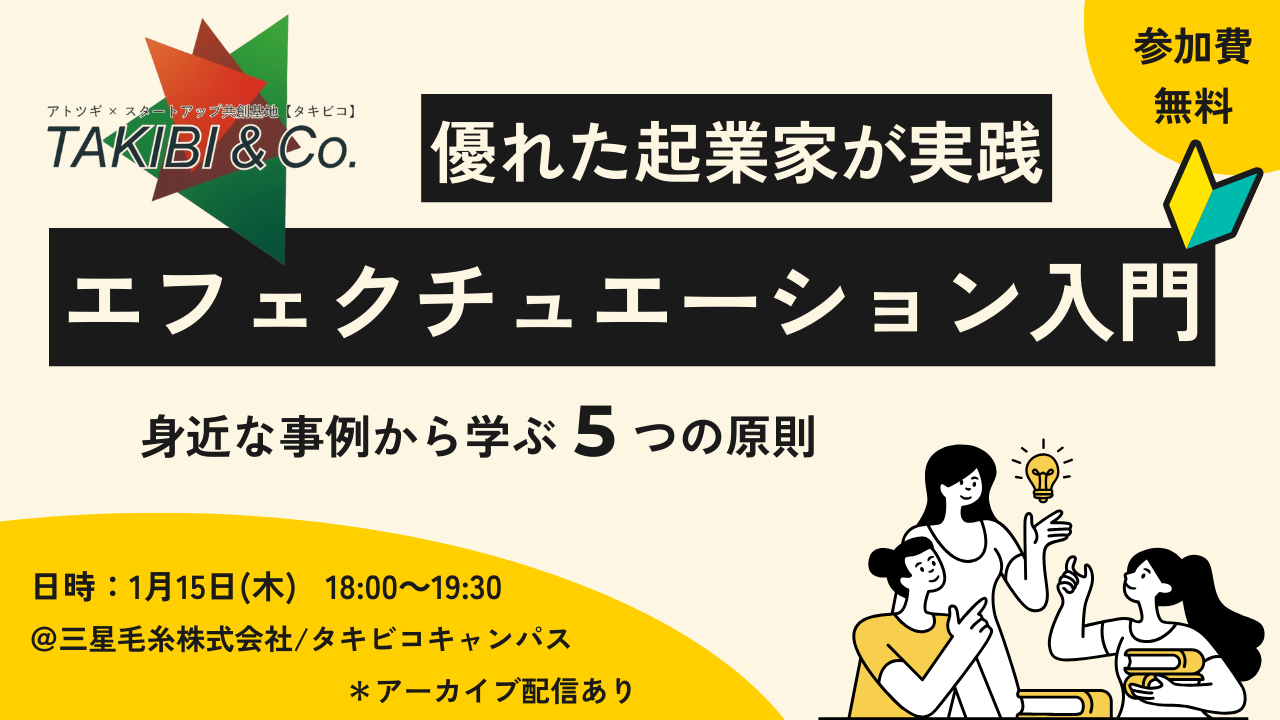 エフェクチュエーションとは、あらかじめ決めたゴールから逆算するのではなく、すごく簡易的な言葉で説明するなら「今ある持ち合わせの材料だけで、とりあえず料理を始めてみる」といった考え方のことです。本イベントでは、この思考法を支える5つの原則を、身近な事例を通して体感的に習得する機会を提供いたします。