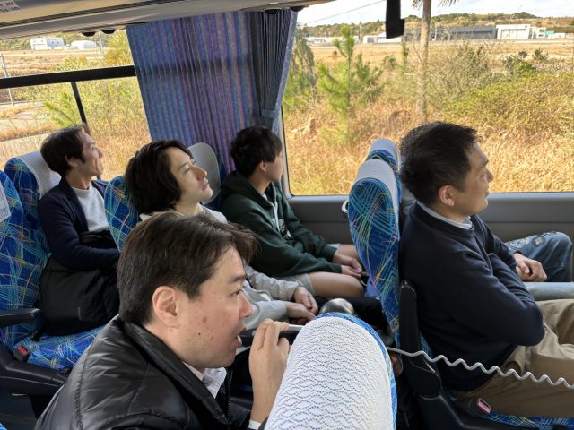 帰りのバスも振り返りの時間に活用。他参加者の学びを聞くのもいいですね。