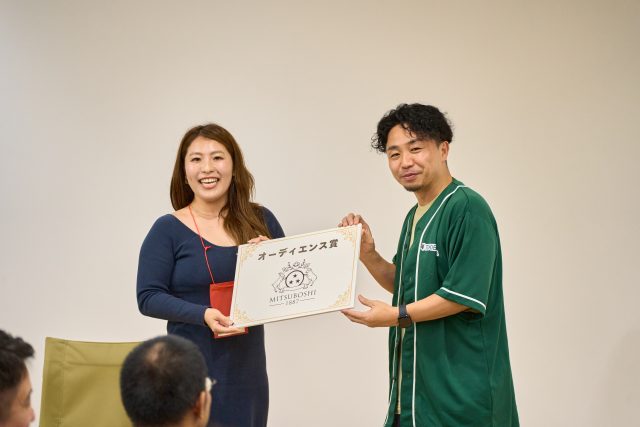 リバースピッチでは一番心を動かした発表者へオーディエンス賞を贈呈。商品は、MITSUBOSHI1887の高級ウールTシャツ🐏
